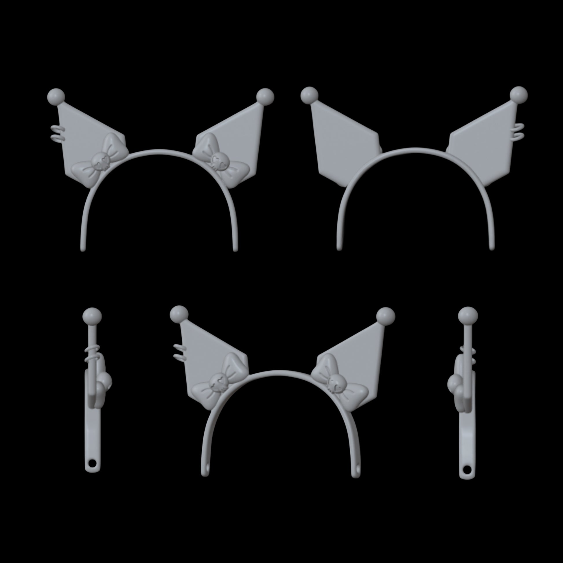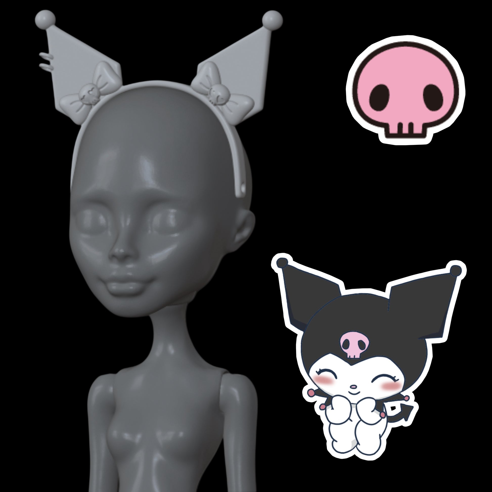 This is a 3d printed kuromi headband. there’s holes on each side to better attach the headband to the dolls head.