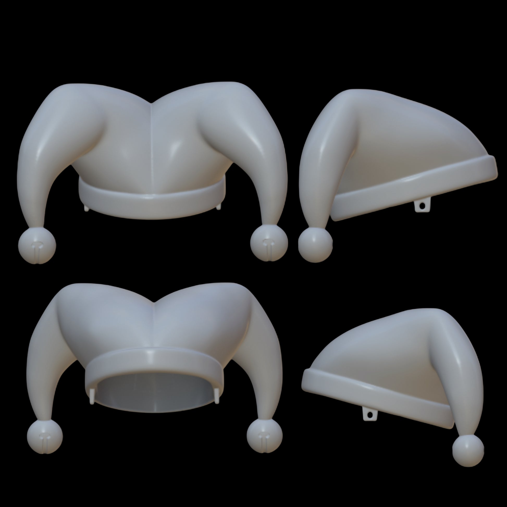 This is a 3d printed pomni hat. there’s holes on each side to help better attach the hat to the dolls head. this style includes the bells.